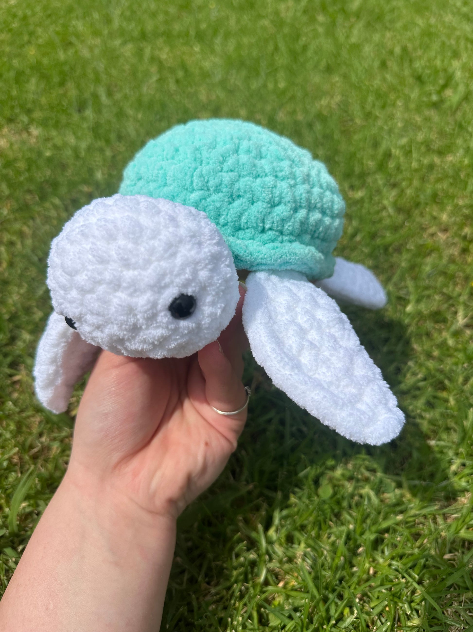 This adorable hand-crocheted blue turtle is made from 100% acrylic yarn and finished with safety eyes. Soft and cuddly, it makes a lovely keepsake, nursery decor piece, or comforting little friend.